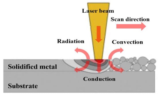 Figure 1 depicts the schematic diagram of the SLM process. During the scan, the laser beam is irradiated on the top surface of the powder bed. Here, a series of complicated physical and chemical phenomena occur in the interaction process of the laser and powder materials, which includes two phases: (1) the reflectivity and absorption of the material’s surface to the laser and (2) heat transfer between powder particles, the processed part and the surrounding environment [].