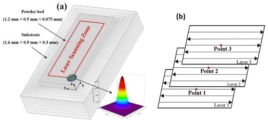 3D Finite Element (FE) model and Gaussian laser energy density (a) and laser scanning pattern in Selective Laser Melting (SLM) process (b). (Point 1 at the centre of layer 1, Point 2 at the centre of layer 2 and Point 3 at the centre of layer 3 respectively).