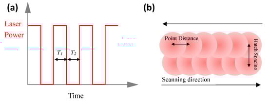 The laser beam had a spot size of 80 μm and was treated with a surface heat flux boundary condition in analysis; its energy density nearly followed a Gaussian function as shown in Figure 2a. The laser moved step by step with the specific ET and PD in the X-direction on the powder bed (named the modulated pulsed laser by Renishaw PLC, Wotton-under-Edge, UK). Parameter ET, represented by T1, concerns the time for which each point is radiated by the laser before jumping to the next point, while the PD data indicates the distance between the adjacent points. The schematic diagram is shown in Figure 3. At a fixed PD value equal to 80 μm, the varying ET values were applied from 100 μs to 180 μs in increments of 20 μs. At a fixed ET value equal to 140 μs, the PD values varied from 60 μm to 100 μm in increments of 10 μm. The process parameters used in the study are shown in Table 1.
