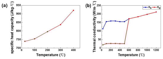 The temperature-dependent thermophysical parameters of AlSi10Mg are shown in Figure 4 []. The twofold thermal conductivity is used to account for melt pool convection beyond the melting temperature []. The effective thermal conductivity of powder can be estimated as follows: