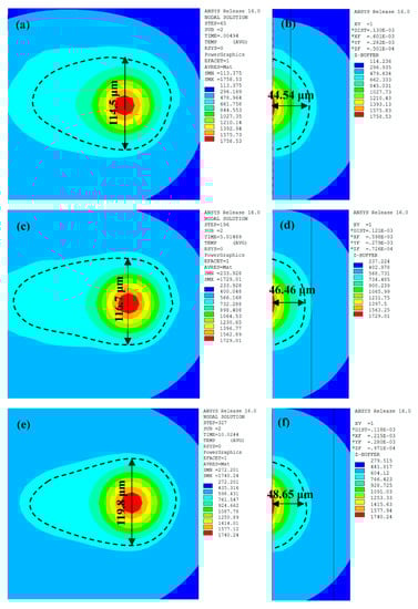The predicted characteristics of the melt pool varied according to the mobile laser exposure. With the laser exposed at point 1, the maximum temperature reached 1758.53 °C with a width and depth of 114.5 μm and 44.54 μm respectively (Figure 5a,b). When the laser moved to point 2, the maximum temperature of the melt pool decreased to 1729.01 °C, while the width and depth increased to 116.7 μm and 46.46 μm, respectively (Figure 5c,d). However, as the laser reached point 3, the maximum temperature increased slightly to 1740.24 °C, with the width (119.8 μm) and depth (48.65 μm) increasing by 2.67% and 4.71%, respectively (Figure 5e,f). It was clear that, although the recoating phase provided sufficient cooling time, there was still a slight heat accumulation effect during the SLM process, thus leading to an increase in the melt pool dimensions. Meanwhile, the dimensions of the melt pool were larger than those in the continuous exposure scan. Ding et al. [] explained that there are two vortexes in the velocity field, thus leading to intense convective motion. Moreover, the range in depth of the melt pool was greater than its range in width. This was because the thermal conductivity was higher in the previous layer than that of the adjacent tracks, and more heat was conducted in the depth direction.