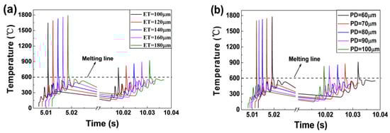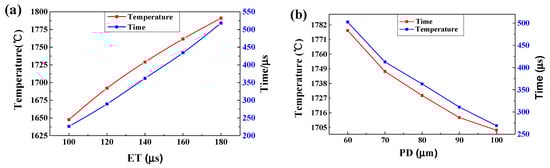 The maximum temperature and the liquid lifetime of the melt pool at point 2. Using different ET (PD = 80 μm) (a) and different PD (ET = 140 μs) (b).
