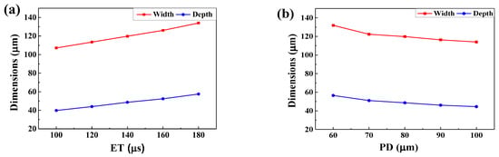 The width and depth of melt pool with different ET (PD = 80 μs) (a) and different PD (ET = 140 μs) (b).