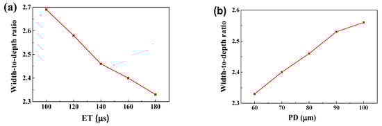 The ratio of width to depth of the melt pool with different ET (PD = 80 μm) (a) and different PD (ET = 140 μs) (b).
