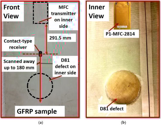 The P1-type macro-fiber composite (P1-MFC-2814) [50] transducer is used as a GW transmitter which is widely used for NDT and SHM of composite structures. Due to its small size, lightweight, high reliability and durability, the macro-fiber composite (MFC) transducers can be easily embedded with the long and composite structures [51]. One of the best features of MFC transducers is that they are efficient transmitters and receivers of the fundamental asymmetric (the A0) and symmetric (the S0) modes of guided Lamb waves [52,53,54]. As guided Lamb waves can propagate up to the long distance through the material with less attenuation, it is used to extract the information about the subsurface defects and delaminations [55,56]. The MFC transducer was glued on the inner side of the sample (Figure 1b). Although P1-MFC produces the S0 mode in a more dominant manner as compared to the A0 mode, the interested GW mode for the analysis of defects also depends on the type of receiving transducer.