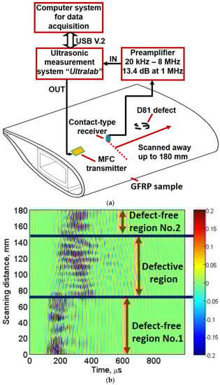 The point-type piezoceramic transducer (Figure 1a) is used as a receiver to record the GW signals during the experimental scanning of a sample. The 6 dB bandwidth of a receiving transducer was up to 300 kHz [57]. The center frequency is 190 kHz. The −10 dB bandwidth was from 35 kHz to 640 kHz which covers the excitation frequency of 43 kHz [57]. To proceed with the contact-type ultrasonic testing by scanning away from this transducer, a conical-shaped protection layer of 2 mm diameter was provided at the bottom of the transducer. The schematic of sample and placement of MFC transmitter and contact-type receiver is shown in Figure 1c. The initial position of the contact-type receiver was at 291.5 mm from the MFC transmitter and it was scanned away up to 180 mm passing through the defective region. The initial end-to-end distance between the receiver and the D81 defect was 75.5 mm.