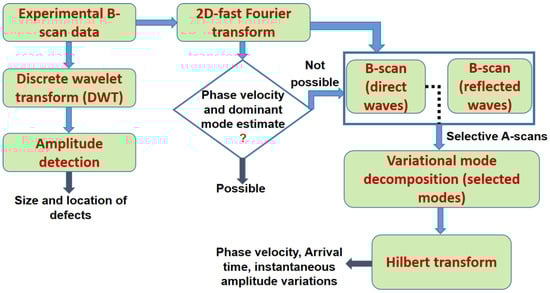The defect characterization and estimation can be possible by signal processing of GW signals. For this purpose, a signal processing algorithm that uses the features of DWT, amplitude detection, 2D-FFT, HT and VMD was developed. The algorithm is presented in Figure 3. There are two data paths. One data path corresponds to the estimation of defect size and location, whereas the other data path is used for the estimation of phase velocities and time delays of the defect-free and defective signal. The description of the signal processing algorithm follows.