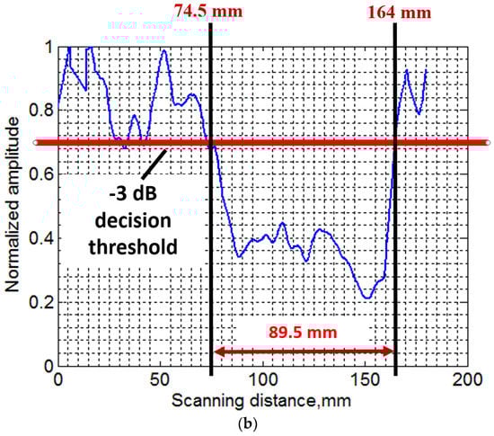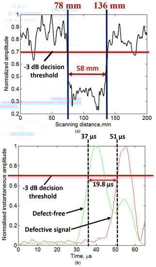 - After wavelet denoising, the amplitude detection technique is used to plot the normalized amplitudes along the scanning distance (0 to 180 mm). The decision threshold of −3 dB is applied to estimate the size and location of the D81 defect.