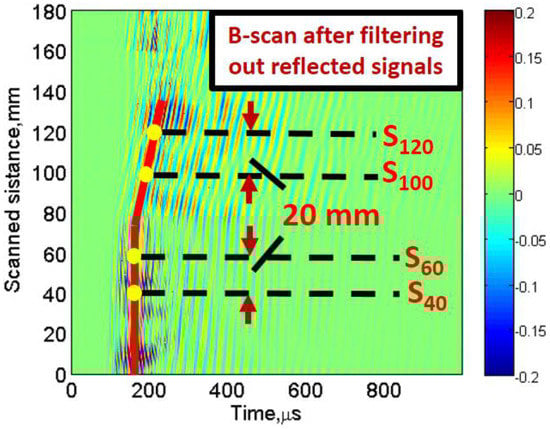 In the next step, reflected signals from the opposite edge of the sample were filtered out from the B-scan signal using 2D-FFT and reconstructed again by applying the inverse of 2D-FFT (2D-IFFT), as described in previous research [71,72]. The reconstructed B-scan with only direct waves (Figure 6) was used for the further processing.