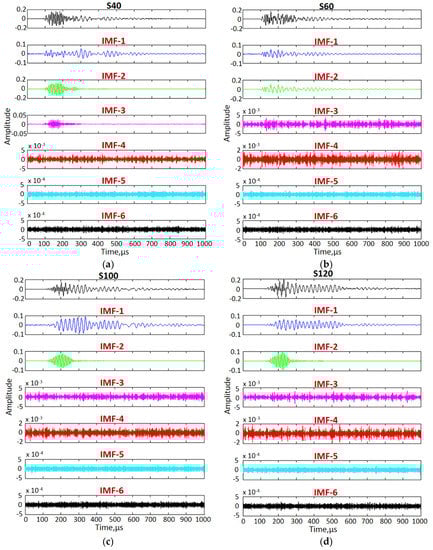 The A-scans (S40, S60, S100 and S120) and their intrinsic modes are presented in Figure 7a–d. The lower IMFs (IMF-3 to IMF-6) contained the significant amount of noise and hence they were removed for the reconstruction of signals. The best way to select the appropriate IMFs is by comparing the power spectral densities of all IMFs to their source signal. It was observed that power spectral densities of IMF-1 and IMF-2 in all four cases were closer to their original signals. Hence, IMF-1 and IMF-2 of all four signals were added to reconstruct new signals (S40’, S60’, S100’ and S120’).