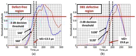 The variation of instantaneous amplitudes of the reconstructed signals (S40’, S60’, S100’ and S120’) with time were estimated using HT, as described in Section 2.4. The time delay between the two defect-free signals (S40’ and S60’) within 20 mm distance was estimated by comparing the instantaneous amplitude characteristics (Figure 8a). Similarly, the time-delay between two signals in the defective region (S100’ and S120’) was estimated (Figure 8b). In both cases, −3 dB threshold level was used to make a decision. The time-delay (td1) between arrival times of two signals acquired at two points (spatial distance was 20 mm) apart in defect-free region was estimated as 13.5 µs, whereas the time-delay (td2) between arrival times of two signals in defective region was estimated as 19.8 µs for the same spatial distance (20 mm). Hence, the approximated value of phase velocity of the propagating wave in the defect-free region and D81 defective region was calculated as 1482 m/s and 1010 m/s, respectively (velocity = distance/time) as compared to the 1253 and 745 m/s, respectively, measured by a SAFE method. The reasons behind such differences is discussed in Section 5.2.1.
