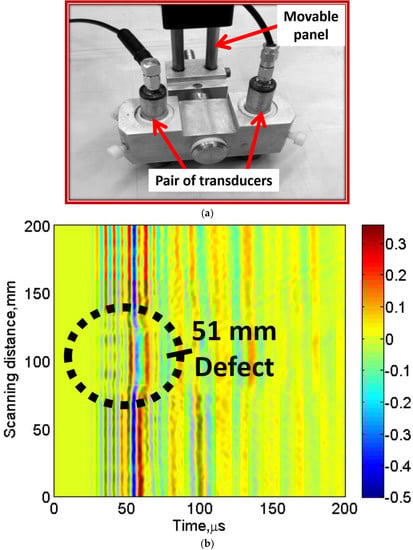 The location of transducers, D81 defect, characteristics of transducers and LF ultrasonic system is described in Section 3.1. The schematic of experimental analysis is shown in Figure 2a. The acquired B-scan image from the linear scanning is shown in Figure 2b along the distance (0–180 mm) and time (0–1000 µs). It can be clearly observed in Figure 2b that GWs are scattered and reflected in the part of B-scan. Thus, defect-free and defective regions can approximately be determined. However, the location, size and characteristics of the defect could not be determined. Hence, a signal processing approach was required for the analysis of defect from experimental B-scan. It should be noted that receiving point-type transducer operates in thickness mode, which is more sensitive to out-of-plane radiations. Although both A0 and S0 contain out-of-plane displacements, A0 has more dominant out-of-plane displacements as compared to the S0. Therefore, the analysis was based on the A0 mode in the registered B-scan image.