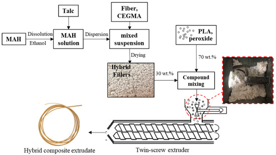 Schematic representation of the simplified preparation of hybrid fillers and extrusion compounding process of the reactive hybrid composites.
