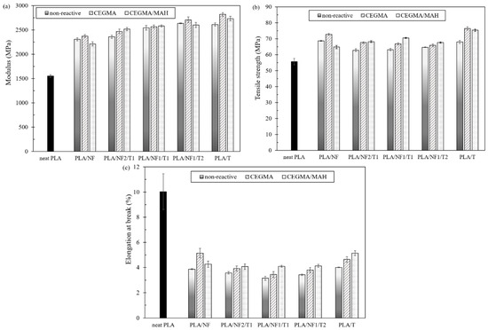 Modulus, tensile strength and elongation at break of neat PLA and PLA/NF/T hybrid composites at different ratios, with and without various reactive compatibilizers, are shown in Figure 2. All PLA hybrid composites showed a much higher modulus and lower elongation at break than that of neat PLA, indicating the enhanced stiffness due to the presence of fillers [33,34]. In addition, the tensile strength of all PLA hybrid composites increased when compared to that of neat PLA, caused by the reinforcing effect of the fillers [35]. As the talc content increased for non-reactive hybrid composites, the modulus tended to increase slightly by 2%, 10% and 14% for NF2/T1, NF1/T1 and NF1/T2 ratios, respectively, compared to PLA-composite-added fiber. These results indicated a more enhanced stiffness of PLA hybrid composites due to the presence of talc. PLA-composite-added talc showed an increase in the modulus, as reported by many researchers [36]. The tensile strength and elongation at break of the hybrid composites were decreased after increasing the talc content, resulting from the poor interfacial adhesion between the fillers and matrix; hence, the stress concentration under loading conditions [29].