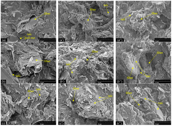 Tensile fracture surfaces of PLA hybrid composites with and without reactive compatibilizers: (a) PLA/NF2/T1; (a’) PLA/NF2/T1/CEGMA; (a’’) PLA/NF2/T1/CEGMA/MAH; (b) PLA/NF1/T1; (b’) PLA/NF1/T1/CEGMA; (b’’) PLA/NF1/T1/CEGMA/MAH; (c) PLA/NF1/T2; (c’) PLA/NF1/T2/CEGMA; (c’’) PLA/NF1/T2/CEGMA/MAH.