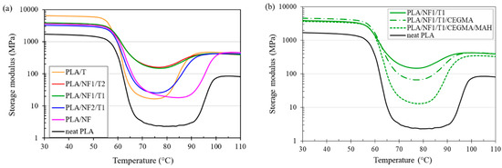 The dependence of the storage modulus versus the temperature of the PLA hybrid composites at different fillers ratios, with and without reactive compatibilizers, is depicted in Figure 4. The storage moduli of all hybrid composites and single filler composites were much higher than that of neat PLA in the glassy region (30–50 °C), which is obviously seen in PLA/T composite. It was noticed that PLA hybrid composites and neat PLA started softening above glass transition temperatures of around 60 °C. It is clear from Figure 4a that the storage moduli of PLA/NF1/T1 and PLA/NF1/T2 hybrid composites dropped slightly in the rubbery region and then leveled off (70–80 °C), indicating an improvement in the heat distortion temperature (HDT) [37] of the hybrid composites compared to neat PLA and single filler composites. In the rubbery region, the storage moduli of hybrid composites at NF2/T1, NF1/T1 and NF1/T2 ratios were increased by 10, 64 and 64 times compared to that of neat PLA, and increased by 2, 10 and 10 times compared to that of the single filler composite. The remarkably-higher storage modulus in the rubbery region of the PLA/NF1/T1 and PLA/NF1/T2 hybrid composites was due to the effect of hybridization, which could not happen in the single filler composites. For the addition of CEGMA or CEGM/MAH, it can be seen in Figure 4b that the storage modulus of the hybrid composite was decreased. For the addition of CEGMA or CEGM/MAH, it was found from Figure 4b that the storage modulus of the hybrid composite was decreased. It was determined that the storage modulus of neat PLA and PLA/NF started to increase again after 90 °C, which was relevant to its recrystallization [38]. The storage moduli of other PLA hybrid composites, with and without both reactive compatibilizers, started to increase again at around 80 °C, indicating a faster crystallization than that of neat PLA and PLA/NF [37]. Figure 5 shows a plot of tan δ (ratio of the loss modulus to the storage modulus) versus temperature of PLA hybrid composites, with and without reactive compatibilizers. Figure 5a illustrates that the tan δ peak height of the PLA/NF/T hybrid composite was lower than that of only the PLA/NF composite, and was much lower than that of neat PLA. PLA-composite-added talc showed the lowest tan δ peak height. This could describe that the mobility of the PLA chain was restricted by the addition of natural fiber [4], and, especially, by adding talc because it was a platy filler [39]. Figure 5b shows that the tan δ peak height of the PLA/NF1/T1 hybrid composite with CEGMA/MAH was higher than that incorporated with CEGMA, and much higher than those of the non-compatibilized hybrid composites.