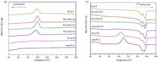 DSC thermograms of neat PLA and PLA hybrid composites at different filler ratios, without reactive compatibilizers, are shown in Figure 6. As the talc ratio increased in the PLA hybrid composites, a large crystallization peak and higher crystallization temperature (compared to that of neat PLA in the cooling scan) were observed. In addition, it was noticed that the peak of the cold crystallization temperature for PLANF1/T1 and PLA/NF1/T2 almost disappeared in the heating scan because the crystallization was completed during a cooling step. In contrast, the cold crystallization peak of neat PLA and PLA/NF appeared at about 110 and 105 °C, respectively, in the heating scan (Figure 7b), due to the low crystallization ability [32]. As is well known, talc is able to induce the crystallization of PLA [12,31,37,40]; hence, more talc concentrations added caused more crystallinity of PLA in hybrid composites as seen in Figure 8. In the case of short-fiber introduction, a slight improvement in crystallinity of the PLA/NF composite compared to that of neat PLA was ddmonstrated. This effect could be attributed to the fact that a small and short fiber acted as a nucleating site for the crystallization of PLA around the surface of the fiber [41]. The effect of the incorporation of various reactive compatibilizers on crystallization of the compatibilized PLA hybrid composites is shown in Figure 7. It was found that the crystallization and crystallinity of the PLA hybrid composites tended to decrease compared to the non-compatibilized hybrid composites, which are clearly illustrated in Figure 7 and Figure 8. However, the cold crystallization on the set temperature of the compatibilized PLA hybrid composites was lower than that of neat PLA, suggesting that its overall cold crystallization rate was faster [42].