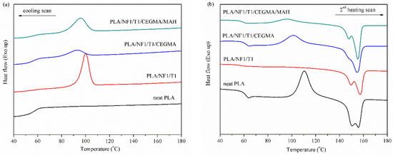 DSC thermograms of PLA hybrid composites with and without reactive compatibilizers at NF1/T1 ratio: (a) cooling scan and; (b) second heating scan.