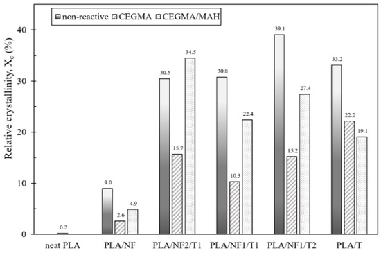 where ΔHm was the melting enthalpy and ΔHcc was the cold crystallization enthalpy measured from the thermogram peak, was the weight fraction of PLA, and was the ideal melting enthalpy for completely crystalline PLA of 93.6 J/g [32].