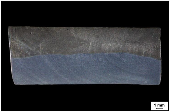 The Fe-Cr-Nb-B nanocrystalline layer, shown in Table 1, deposited by MMA with a 3.2 mm covered electrode on an S355N steel alloy substrate is shown in Figure 1. MMA deposit welding was performed with a constant direct current of 100 A in the flat position (PA). During welding, the electrode was set at an angle of 90° with respect to the surface of the welding base. The sheet surface was ground and pre-heated with a gas torch to a temperature of 80 °C.