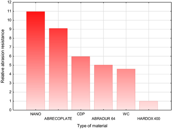 Comparison of the results of relative abrasive wear resistance of selected construction materials.