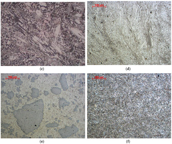 Microstructure of layers resistant to abrasive wear. (a) NANO; (b) ABRECOPLATE; (c) CDP; (d) ABRADUR 64; (e) WC; (f) HARDOX 400; Reagents selected for abrasion resistant material.