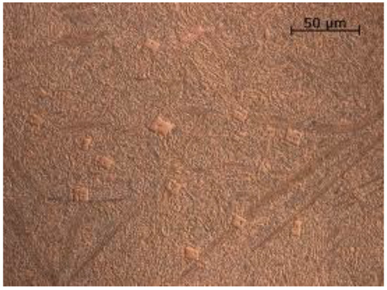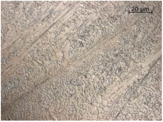 Metallographic examinations carried out on a scanning microscope technique (SE) revealed large amounts of primary carbide precipitates highly dispersed in the zone of the nanocrystalline matrix, as shown in Figure 8 and Figure 9.