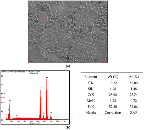 (a) SEM image of the nanostructural layer microstructure over the EDS analysis area—a precipitation of chromium carbide; (b) the EDS spectrum showing the above indicated spot-separation of chromium carbide and results of the quantitative elemental analysis.