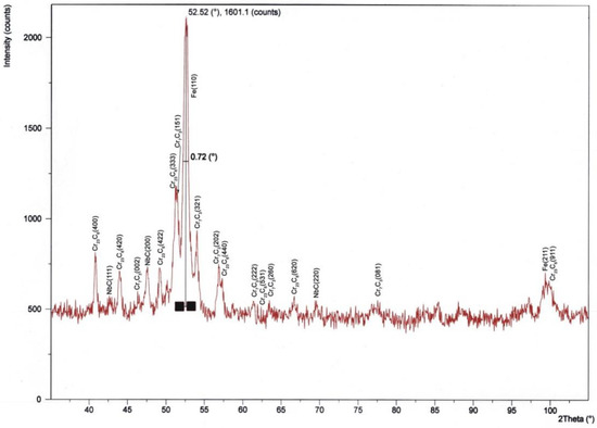 Analysis of the diffraction pattern of the nanocrystalline layers of Fe-Cr-Nb-B showed the presence of reflections from the three types of carbides (Figure 12):
