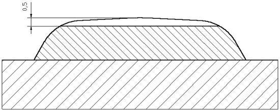 The abrasion-resistant layer was deposited by manual welding of an S335JR steel with a covered electrode, DIN 8555: E 10-UM-65-GR with a diameter of 5.0 mm and a welding current of 270 A. The welding process was carried out using a buffer layer made with a covered electrode, ERWS 19-12-3 L with a diameter of 3.25 mm and a welding current of 110 A, as shown in Figure 4. The purpose of the buffer layer was to transfer the stresses between the base material and hardfacing. The chemical composition and properties of the weld metal, ABRADUR 64 are given in Table 4.