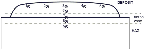 In order to determine the hardness of the tested materials, the Rockwell hardness measurement was carried out in five places on the weld face/sheet surface and in four locations on the deposit weld/sheet cross-section using the Vickers method at a load of 1000 g, shown in Figure 13 and Figure 14. Hardness measurement results are shown in Table 8 and Figure 15.