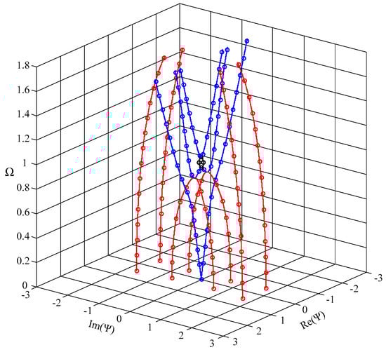 Dispersion curves of Lamb wave in a steel plate; hollow dots-our results, solid lines-literature results from the spectral collocation method; real branch in blue, purely imaginary branch in black, complex branch in red.