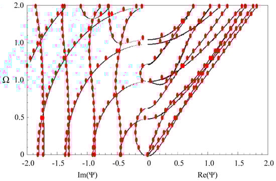 To check the validity and the efficiency of our approach, we make a comparison between our results and the literature results. Because there is no investigation on the evanescent waves in FGPPM so far, we compute the full spectrum of Lamb wave in a steel plate and make a comparison with the available results in literature [] from a spectral collocation method. The calculating parameters are ρ = 7932 kg/m3, C11 = 281.757 GPa, C12 = 113.161 GPa, C44 = 84.298 GPa, and h = 10 mm. The non-dimensional frequency and wave number are defined as , , respectively. The resulting dispersion curves are given in Figure 2. It clearly shows that the numerical results obtained by the present polynomial approach agree well with those obtained by the spectral collocation method, which validates our approach and program.