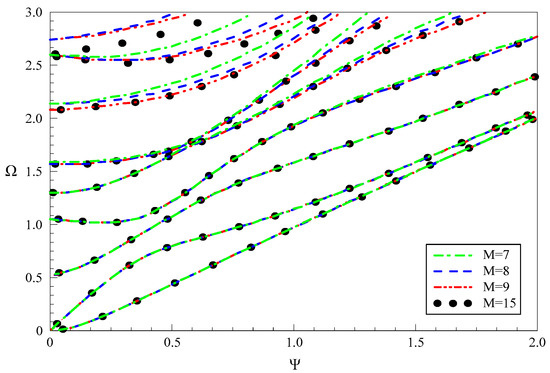 Then we discuss the convergence of the present polynomial approach. We present dispersion curves of propagating Lamb-like wave in a linear FGPPM plate with electric and magnetic open circuit and h = 1 mm, when the truncation order M takes 7, 8, 9 and 15, respectively, as shown in Figure 4. It can be seen that more and more order modes converge as M increases. When M = 7, the first three modes are convergent. The first four when M = 8, and the first seven when M = 9. So, we can think that at least the first (M − 1)/2 modes are convergent. Similarly, this can be concluded for the purely imaginary modes, and we don’t present the dispersion curves of purely imaginary branches for saving space. For evanescent Lamb-like waves, we tabulate the results in Table 3 since graph is not convenient for comparison. These numerical results also show that the complex solutions are convergent as M increases. When M = 10 and M = 11, the first three modes are convergent. The first four when M = 12, the first five when M = 13, and the first six when M = 14. Obviously, the real solution is easier to converge than the complex one. From these results, good convergence of the present approach can be observed. We take M = 30 in this paper.