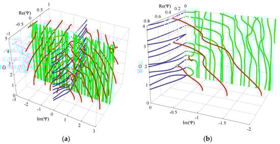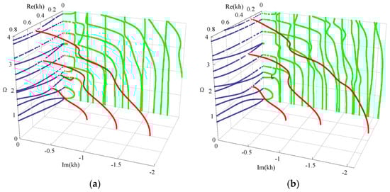 3D dispersion curves of Lamb wave: (a) cubic graded field, (b) sinusoidal graded field. blue—real branches, green—purely imaginary branches, red—complex branches.