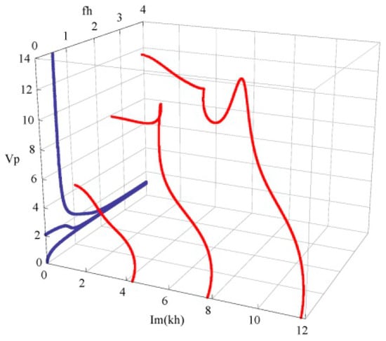 Figure 6 shows the phase velocity dispersion and attenuation curves of the first three propagating and complex branches. The dimensionless phase velocity and frequency and attenuation are defined by , and . We can find from these curves that the phase velocity of a propagating mode is decreased and gradually tends to a steady value with increasing frequency, but the velocity of an evanescent mode becomes bigger as well as the attenuation decreases. At high frequency, the evanescent mode has a very small attenuation, and its phase velocity is noticeably bigger than that of a propagating mode. For example, at fh = 2–3, the phase velocity of the second evanescent mode is about 8, but that of the propagating mode is below 2. Also, the wave dispersion is quite weak in this frequency range.