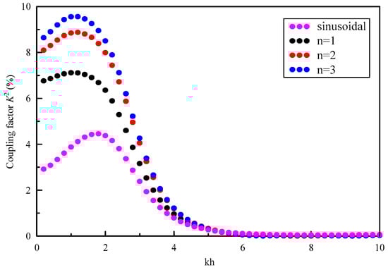 To illustrate the effect of graded field on the K2, we calculate the K2 for S0 modes of four different FGPPM plates, as shown in Figure 10. We can find that the K2 reaches a maximum at a certain wave number and tend to the same little value with increasing wave number, which implies the influence of the graded field on the energy propagation of Lamb wave in high-frequency zone is insignificant. It reaches a maximum from 4.4% for the sinusoidal graded field to 9.5% for the cubic graded field. They are located near kh = 2 and kh = 1.5 respectively. The K2 for the cubic graded field is always bigger than that of the other three graded cases. Also the maximum of K2 shifts to the smaller wave number when the graded power exponent is increasing.