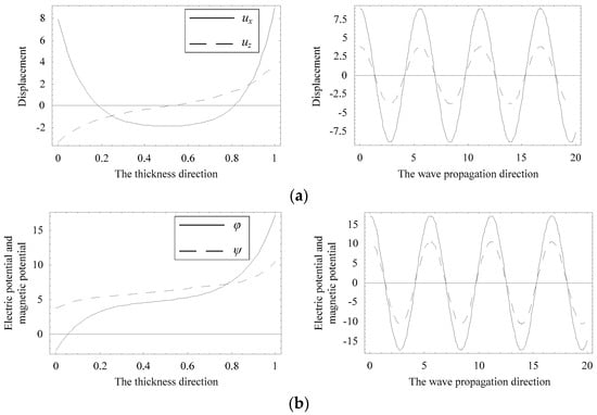 For Lamb waves propagating along the x direction, the displacement components, electric potential and magnetic potential can be expressed as