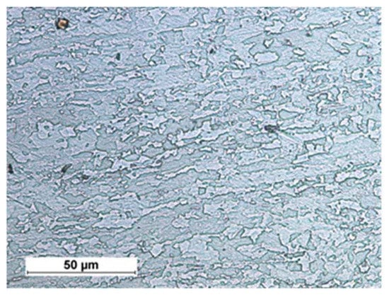 The tests aimed to verify the possibility of making welded joints in TMCP steels using the laser beam without the filler metal. The tests involved 10 mm thick, high-yield-point steel S700MC obtained in the industrial manufacturing process. The chemical composition and properties of the steel are presented in Table 1, whereas the structure of the steel is presented in Figure 1.