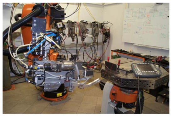 The bead-on-plate welding and joints welding tests were performed using a TruLaser Robot 5120 robotic laser welding station (TRUMPF GmbH + Co. KG, Ditzingen, Germany) (TRUMPF). The station included a TruDisk 12002 disc laser having a maximum power of 12 kW and provided with a working head attached to a six-axis KUKA KR30HA industrial robot (Figure 3). The welding of the T-joints also involved the use of a D70 head (TRUMPF) connected to the disc laser using an optical fibre having a diameter of 0.3 mm. The laser welding head used in the tests was characterised by the following optical parameters: