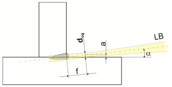 To adjust appropriate parameters enabling the obtainment of proper T-joints, it was necessary to perform bead-on-plate welding tests using various process parameters. An adopted bead-on-plate welding speed of 2 m/min was constant, whereas parameters subjected to changes included the power of the laser beam and the position of the laser beam focus. The above-presented bead-on-plate welding speed ensured that the efficiency of the laser welding of T-joints would be significantly higher than that obtained using arc methods when welding the same type of joints. It was noticed that the bead-on-plate welding process was more stable (fewer spatters formed) when the laser beam focus penetrated the material subjected to welding (negative values of parameter f). Metallographic tests were used to determine the geometrical dimensions of the penetration run in relation to a given group of parameters. Afterwards, a graphic software GIMP2.10.4 (Free Software Foundation, Inc., Boston, MA, USA) programme was used to outline the fusion lines of the plate penetration run and to plot the above-named shape of the weld on the schematic diagram of the T-joint (Figure 2). The foregoing combined with theoretical calculations of the focused beam divergence angle made it possible to adjust the power parameters of the double-sided welding of T-joints, an appropriate laser beam insertion angle, and the position of the laser beam focus in relation to the interface of plates to be joined: