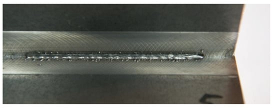 At the same time, on the weld face side, it was possible to observe the incompletely filled groove along the entire length of the joint (Figure 7). Because of the very narrow window of stable single-sided welding parameters, it was ascertained that an alternative (competitive) solution could include double-sided welding, ensuring the formation of the proper weld face and providing significant flexibility as regards changes in welding process parameters (Figure 8). The welding process parameters in relation to selected joints are presented in Table 2.