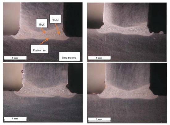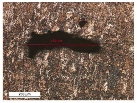 The microscopic tests revealed the presence of gas pores in the welded joints. The formation of the above-named gas pores could be ascribed to the fast crystallisation of the liquid metal pool triggered by very high welding rates responsible for the impeded release of gases from the weld zone. The gas pores could form as a result of the confinement of gases dissolved in the metal or as a result of the evaporation of alloying elements or impurities, if any, located on the surface of the interface of the joined sheets. The identification of the significance of the above-named imperfection required the performance of verification tests based on the PN-EN ISO 13919-1:2002 standard [33] (Table 3). The welded joint subjected to the verification of quality (i.e., joint No. 3) was characterised by the presence of the greatest gas pore (Figure 11).