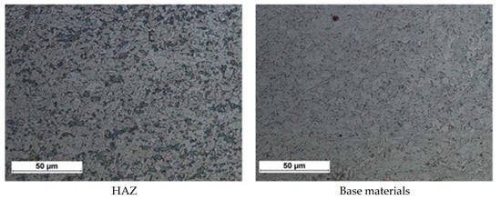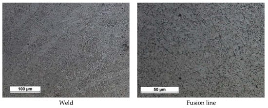 The microscopic tests concerning the weld area revealed the bainitic-ferritic structure. The HAZ area did not reveal any significant changes in the grain size in relation to the base material. The foregoing was related to a very low heat input to the welded joint area during the laser welding process (Figure 10).