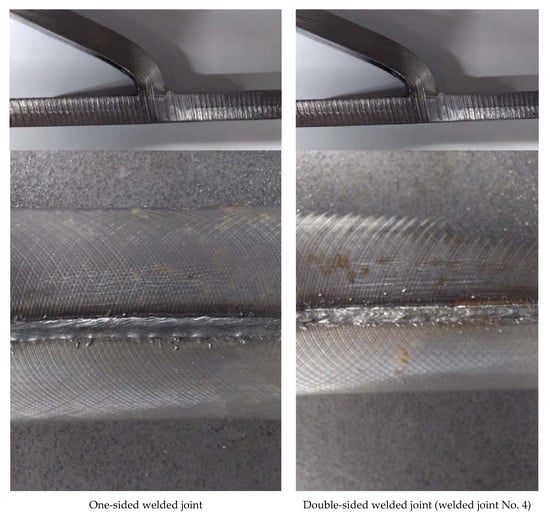 The research-related visual tests enabled the elimination of joints characterised by the lack of penetration or excessive penetration on the root side. The remaining, double-sided joints were characterised by the proper geometry of the welds (Figure 9).