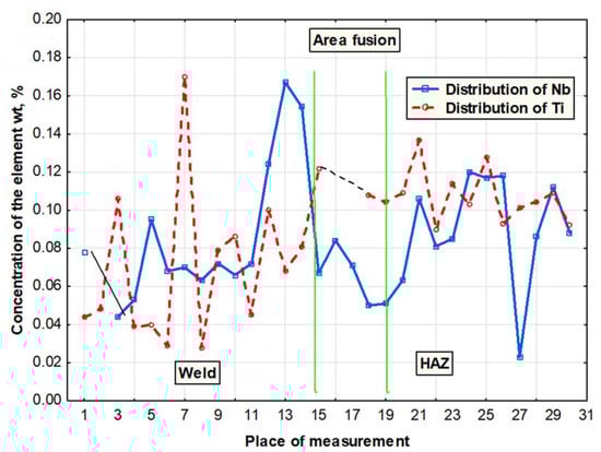In the laser welds made without the use of the filler metal, the contents of Ti and Nb were significantly higher than those in the welds made using the filler metal. Higher contents of hardening constituents could lead to decreased toughness in the weld area in comparison with that of the base material. An increase in the contents of microalloy elements was particularly visible near the fusion line, which was confirmed by the detailed analysis of the chemical composition performed using an electron microprobe X-ray analyser (Figure 14). Certain weld areas near the fusion line contained high amounts of titanium and niobium, which indicated the presence of clusters of carbonitride precipitates which had not dissolved entirely in the liquid metal pool. The excessively high concentration of hardening phases in the fusion area could have a highly adverse effect on the plastic properties of the weld [34,35].