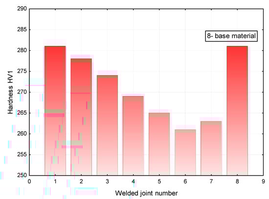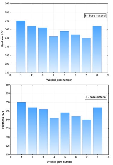 The analysis of the hardness measurement results revealed that a change in the laser beam power during welding performed at a constant welding rate did not significantly affect the hardness in the weld area. The hardness of the weld was restricted within the range of 340 HV1 to 350 HV1, whereas the hardness of the base material amounted to 280 HV1 (Figure 16). The HAZ area hardness was significantly affected by welding linear energy and the position of the laser beam focus. In terms of the HAZ, the highest hardness was observed in the joints made using a laser beam power of 7 kW (approximately 280 HV1). An increase in the laser beam power to 11 kW was accompanied by a decrease in the hardness of the HAZ area to 260 HV1 (Figure 17). Because of the contact hardening phenomenon, the above-named softening of the HAZ did not reduce the mechanical properties of the welded joint.
