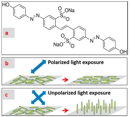 (a) Molecular structure of brilliant yellow. (b) When exposed to polarized light, brilliant yellow molecules undergo in-plane re-orientation to a direction of 90 degrees with respect to the light polarization direction. (c) When exposed to un-polarized light, brilliant yellow molecules undergo out-of-plane re-orientation to a direction along to the light propagation direction.