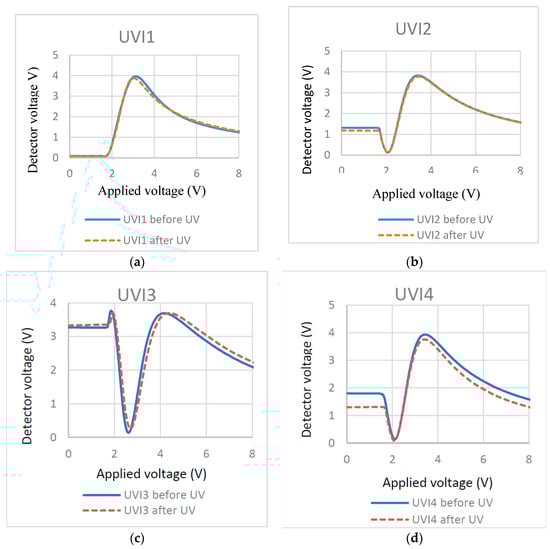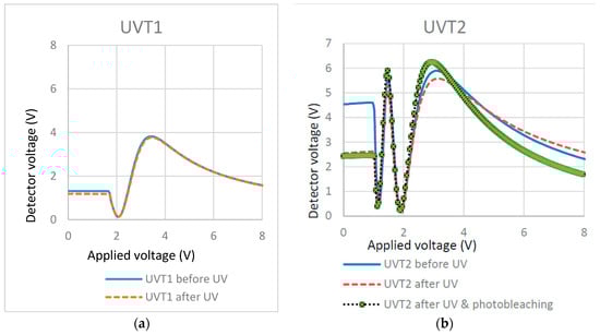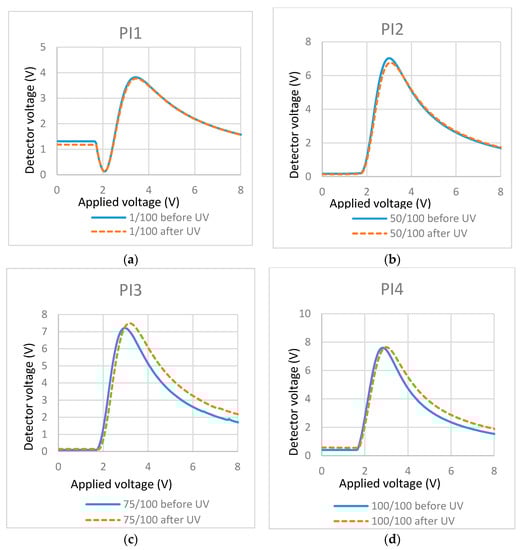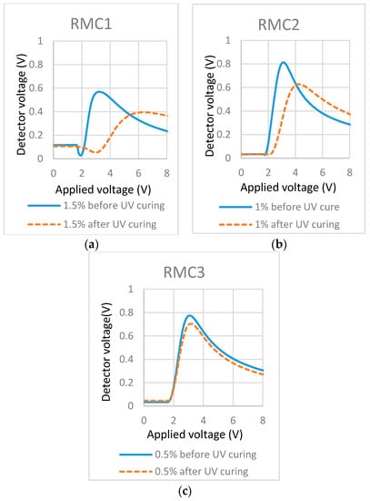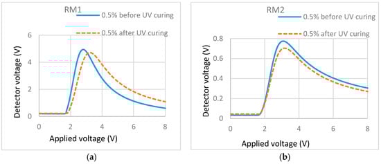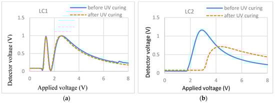 To investigate the effects of UV light intensity on the surface localized stabilization, we polymerized cells filled with 0.3% RM257 in ZLI-4792 with different UV intensities. Their effects were illustrated in T/V curves (Figure 8) before and after polymerization.
