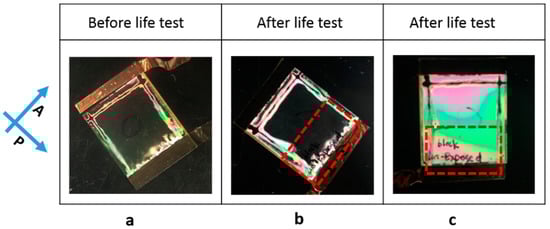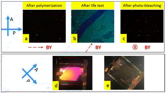 Polarized microscope images of the cell (0.5% cell in Figure 2): (a) before life-test; (b) after life test; and (c) after photo-bleaching. The BY alignment was represented by a red dash arrow with a dynamic re-orientation direction after the life-test and photo-bleaching with respect to the polarizer and/or analyzer direction. Macroscopic observation of cells after photo-bleaching when the original LC alignment was 45° to polarizer (d) or parallel to one polarizer (e).